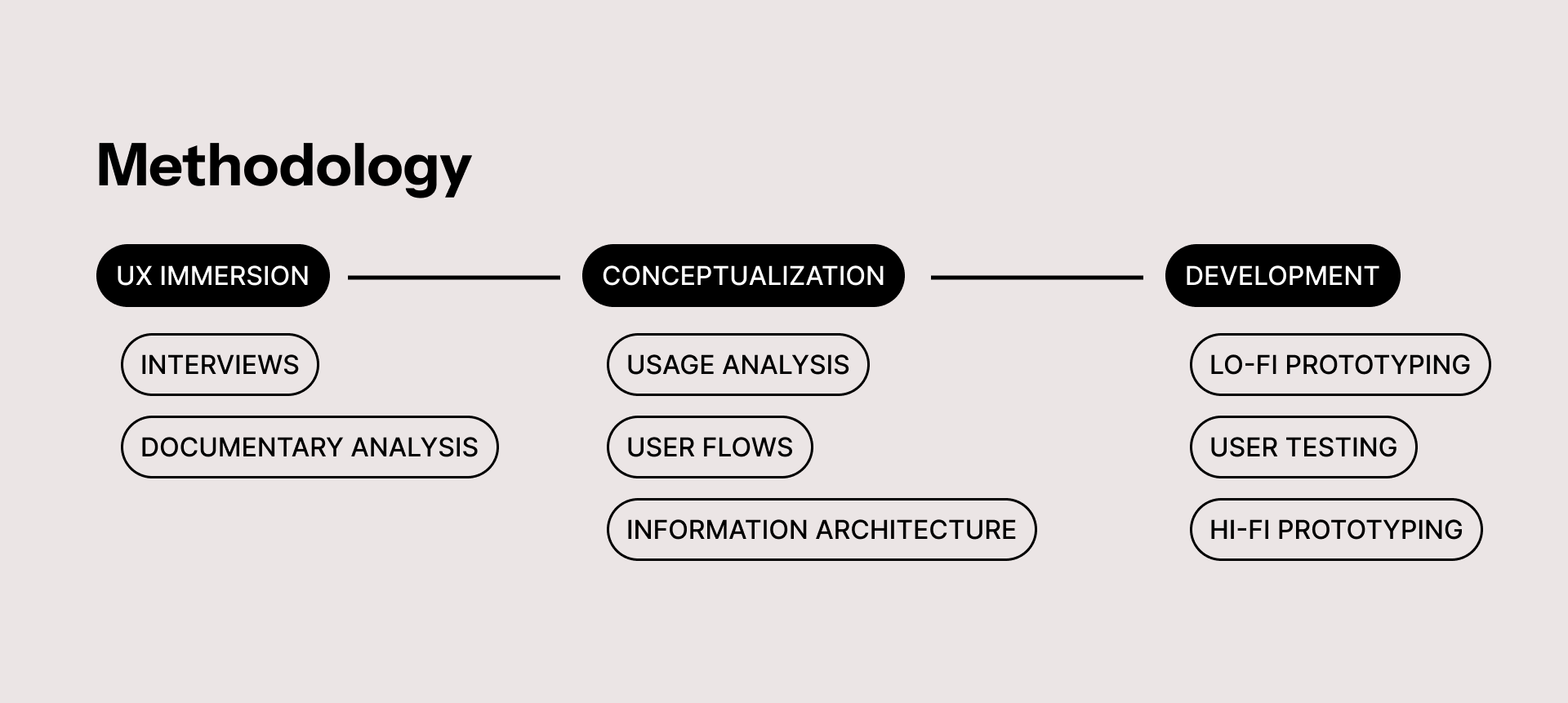 Interviews / Documentary analysis /Usage analysis / User flows / Information architecture / Lo-Fi & Hi-FiPrototyping / User testing