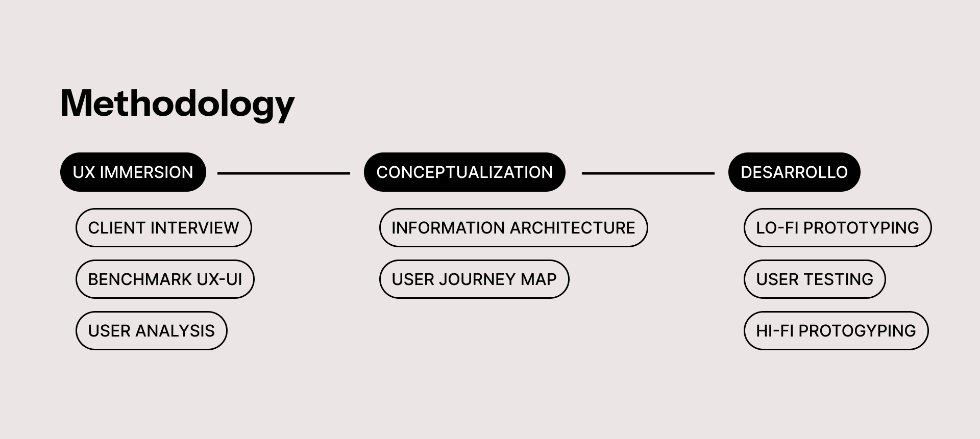Interviews / UX-UI benchmarking / User analysis / Information architecture / User Journey Map / Lo-Fi % Hi-Fi Prototyping / User testing